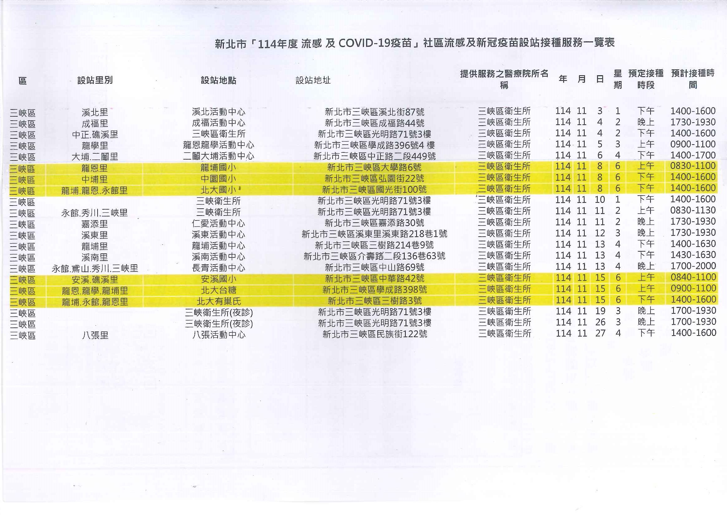 【三峽衛生所】114年11月社區流感及新冠疫苗設站接種服務一覽表