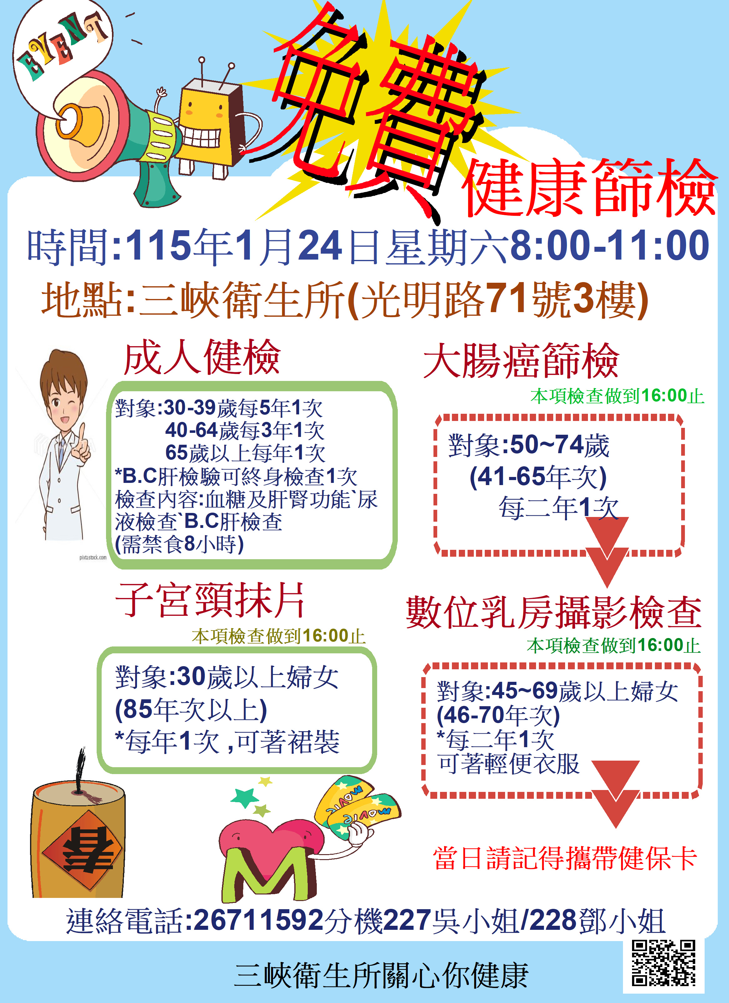 【三峽衛生所】1/24(六)免費健康篩檢