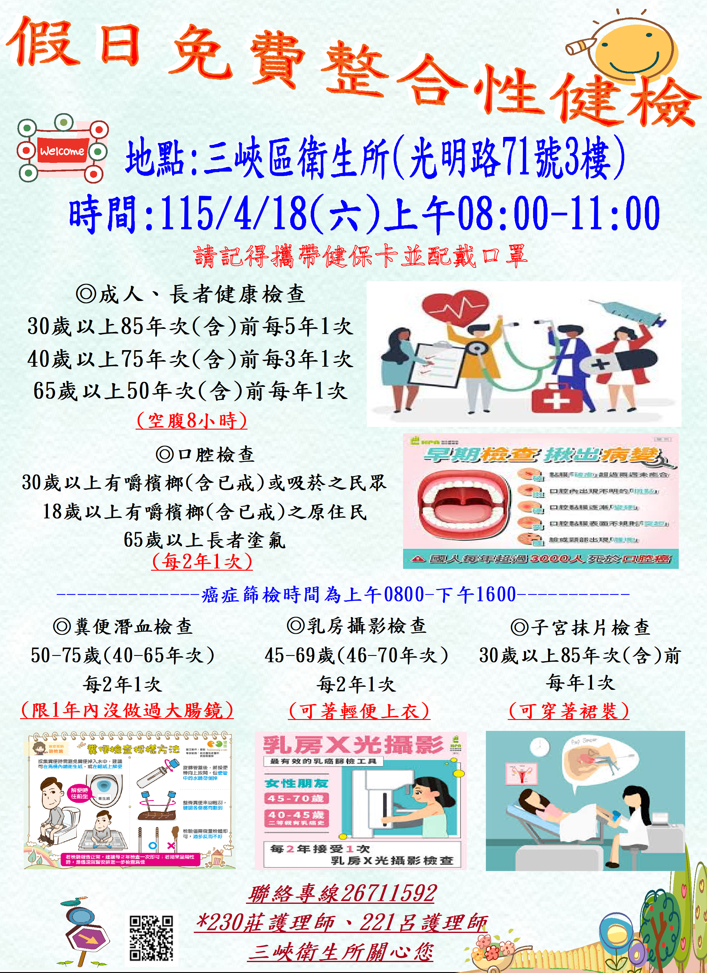 【三峽衛生所】4/18(六)假日免費整合性篩檢
