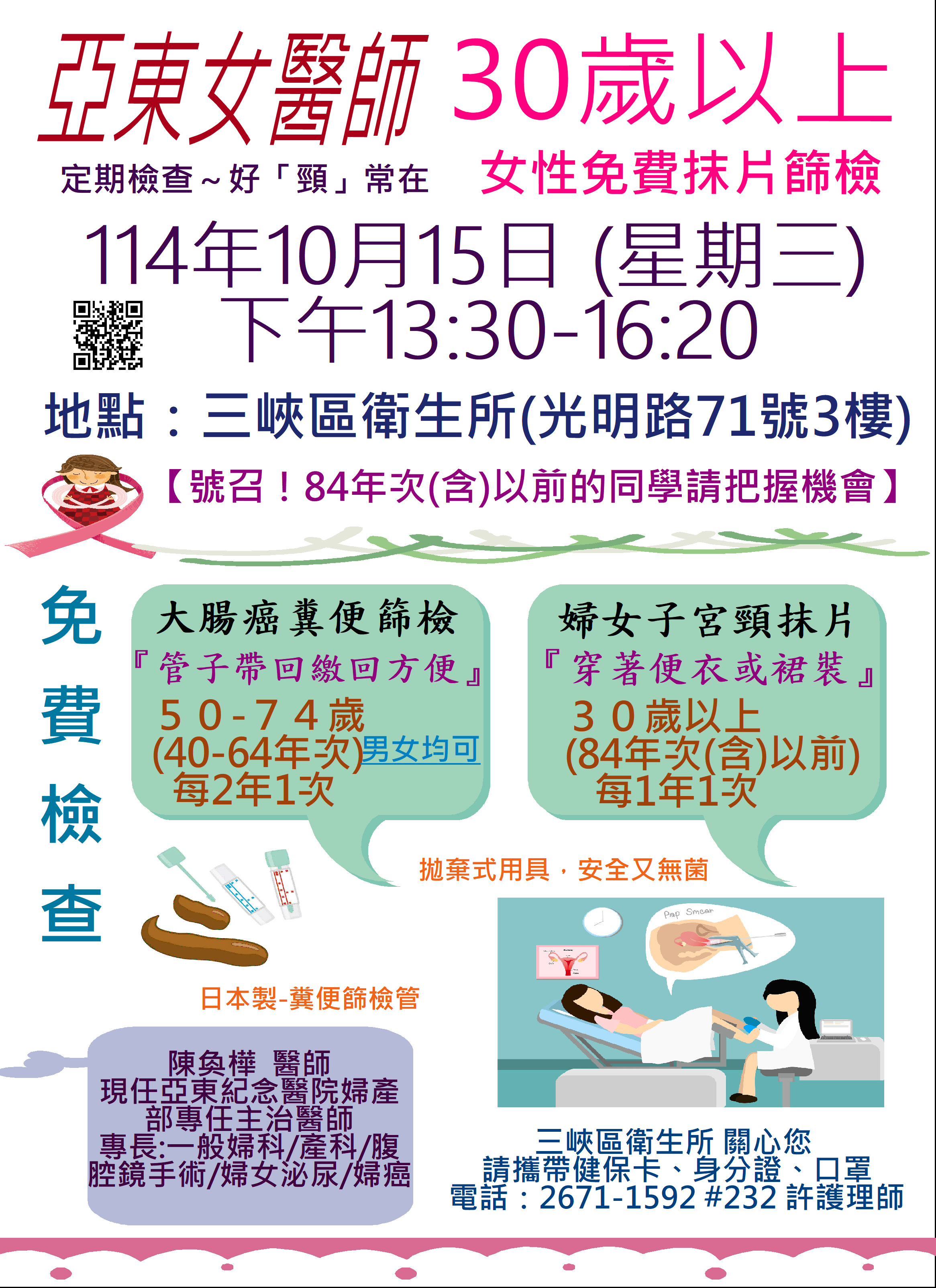 【三峽衛生所】10/15(三)亞東女醫師抹片